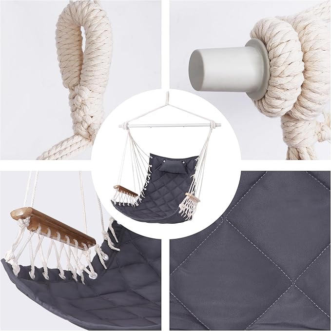 Hammock Chair Hanging Swing with Wooden Armrests;Steel Spreader Bar,Pillows,Hardware kit Included;Cotton Woven Fabric;Up to 350 Lbs,for Indoor or Outdoor