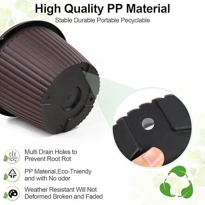 - 【Perfect Size & sturdy Material】Top diameter: 12 inch, bottom diameter: 7.8 inch, height: 8.2 inch, capacity: 2.6 gallon. Large plastic plant pots are made of recyclable polypropylene resin which is lightweight but sturdy, not easy crack. These indoor outdoor planters are UV and weather resistant. 12 inch flower pot is perfect for planting medium to large sized plants.