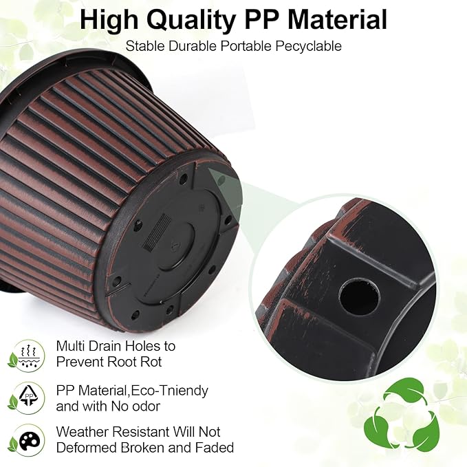 - 【Perfect Size & sturdy Material】Top diameter: 10 inch, bottom diameter: 6.7 inch, height: 7 inch, capacity: 1.7 gallon. Plastic plant pots are made of recyclable polypropylene resin which is lightweight but sturdy, not easy crack. These indoor outdoor planters are UV and weather resistant. 10 inch flower pot is perfect for planting medium to large sized plants.