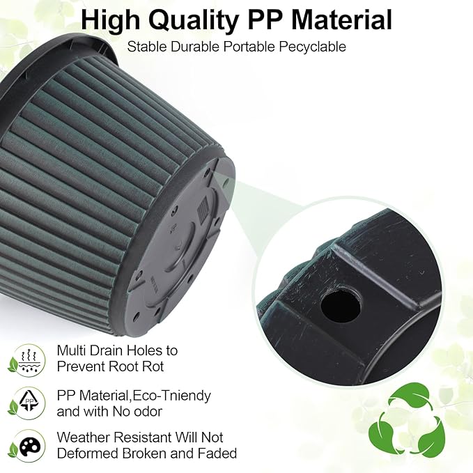 - 【Perfect Size & sturdy Material】Top diameter: 10 inch, bottom diameter: 6.7 inch, height: 7 inch, capacity: 1.7 gallon. Plastic plant pots are made of recyclable polypropylene resin which is lightweight but sturdy, not easy crack. These indoor outdoor planters are UV and weather resistant. 10 inch flower pot is perfect for planting medium to large sized plants.