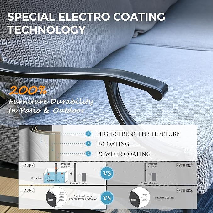 - 【RELIABLE ALL-WEATHER METAL CONSTRUCTION】Built from durable metal with E-COATING and POWDER-COATING finish, ensuring resistance to all weather conditions, rust-proof qualities, and easy maintenance. The sturdy wrought iron frame can withstand various weather conditions, with the single chairs supporting up to 350 lbs and the 3-seater sofa accommodating up to 900 lbs, promising long-lasting reliability and durability