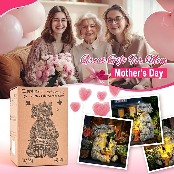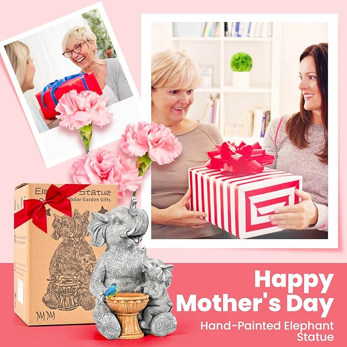 - Unique Solar Light Design: This unique solar powered figurine showcases a baby elephant comfortably nestled on its mother's lap, both by a playfully painted pool with a bird. Ideal as heartwarming gifts for Mother's Day and the prime gifting seasons, it captures the essence of joyful moments spent with loved ones