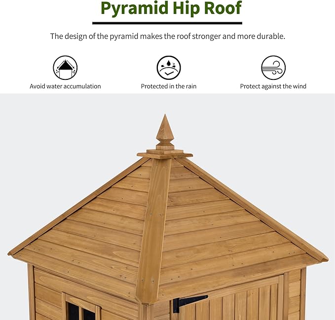 - Pyramid Hip Roof: 4 sides sloping roofs are made of solid wood pieced together. The unique design of the vertical storage shed roof effectively prevents the accumulation of water and snow.