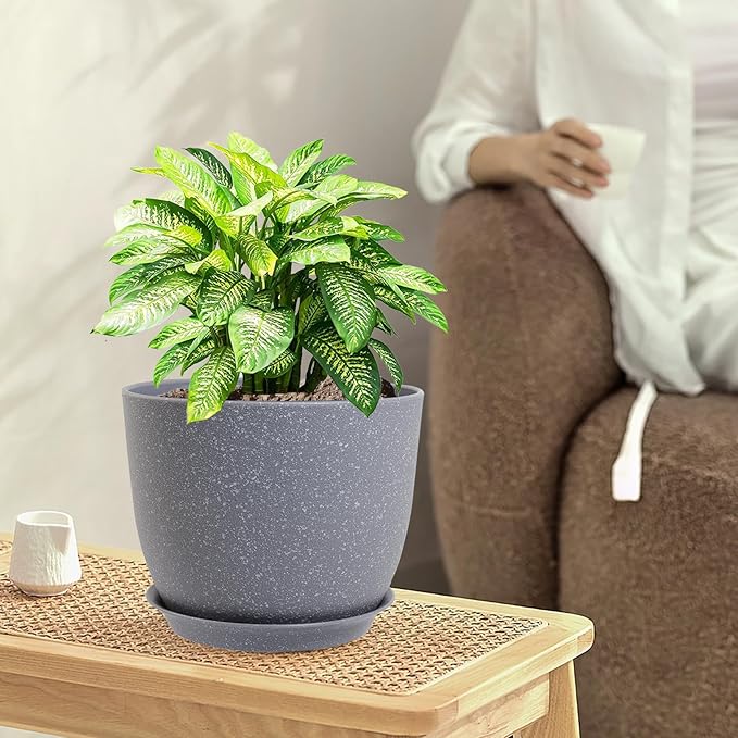 Flower Pots 9/8/7.5inch, Set of 3 Modern Decorative Plastic Planters with Drainage Holes and Saucers for Garden House Plants, Plant Pots for Indoor Outdoor Plants, Speckled Grey
