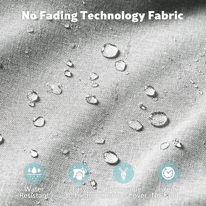 - Non-Fading Fabric:3-Year-Non-Fading,made with high-density foam that is soft and supportive, and covered with a breathable fabric that is easy to clean and maintain. The cushion covers are also water resistance, stain-resistant, ensuring they remain in excellent condition in all weather conditions
