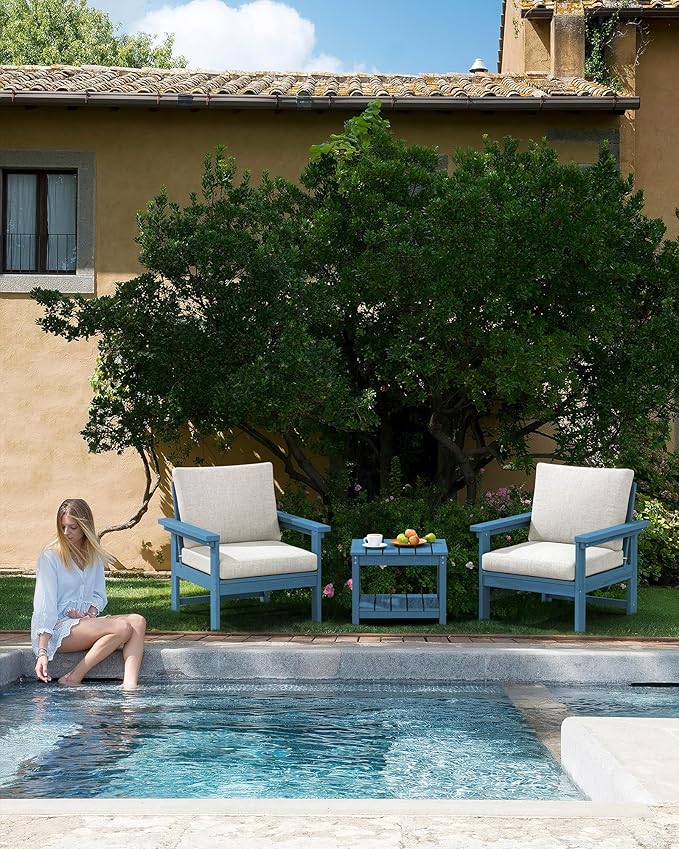 SERWALL HDPE Patio Sofa Set, 3-Piece Sectional Outdoor Furniture Set, All Weather Outdoor Couch Set Patio Furniture Set for Deck, Lawn, Blue Frame with Khaki Cushion