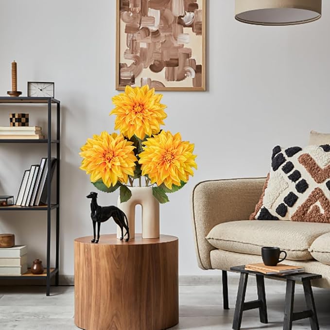 - 💐✨【Easy to care】Are you tired of dying flowers? Then our autumn artificial dahlia flowers will be perfect for you. Unlike fresh flowers used for flower arrangement which require everyday upkeep, the dahlias fake flower can be placed and reusable in many settings for a long period without any care. Green stems and leaves, bright flowers, let your room and life exude a strong breath of love and life. Bringing beauty and good mood to your day, they are a great addition to your spring displays!