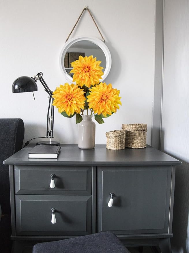 - 💐✨【Package】Total 3 pieces come in a pack(Vase not included). Artificial dahlia flower total height -- 27.5 inches. Each one flower head approx 7.5 inches in diameter. Long stem will look beautiful in a big floor vase or tall jar, and it is made of metal and plastic, if the stem is too long for your vase, You can bend or cut them to adjust the size as needed.