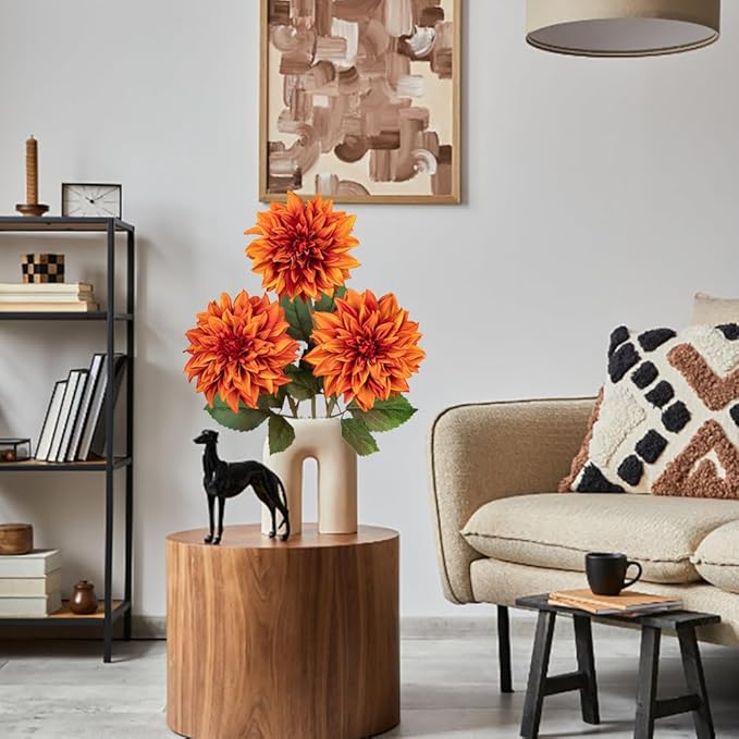 3Pcs Orange Artificial Dahlia Flowers Fall Fake Flower Silk Flowers with Long Stem 27.5" Floral Arrangements Bouquets Autumn Faux Dahlias Flowers for DIY Wedding Party Centerpieces Home Decor