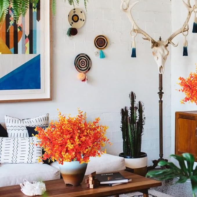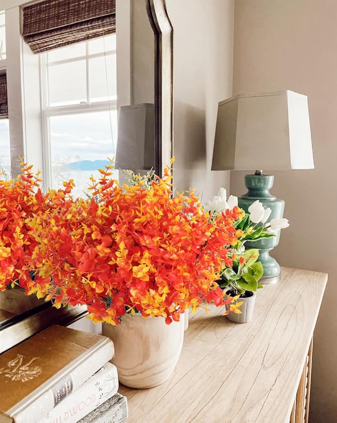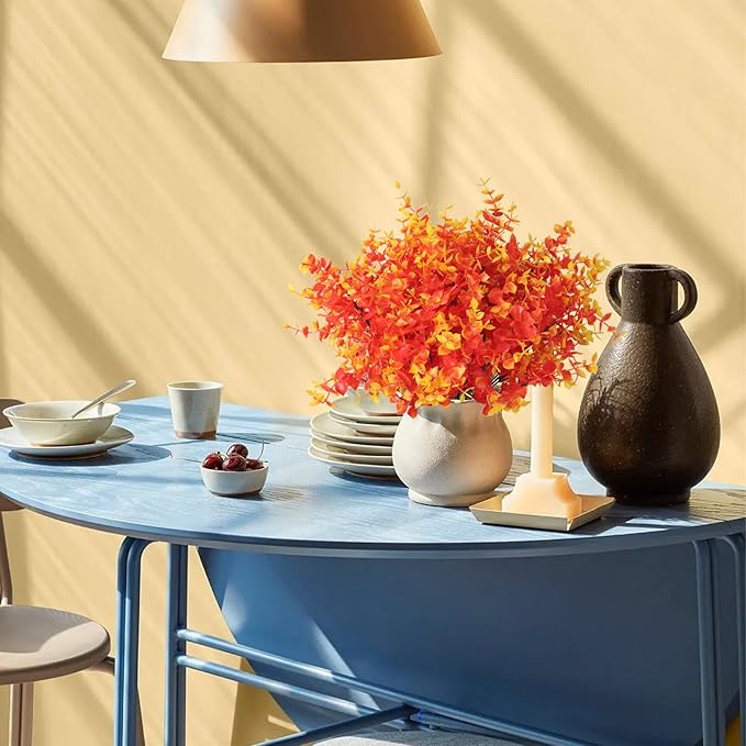 - 【8 Bundles Artificial Fake Flowers】- You will get 8 Bundles artificial flowers, these flowers are handmade to offer a more unique look in every bundle. Each plastic flowers has 7 flexible stems and bushy eucalyptus leaves. The artificial outdoors flowers' height is 13.8".