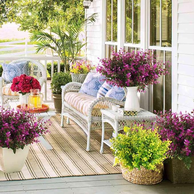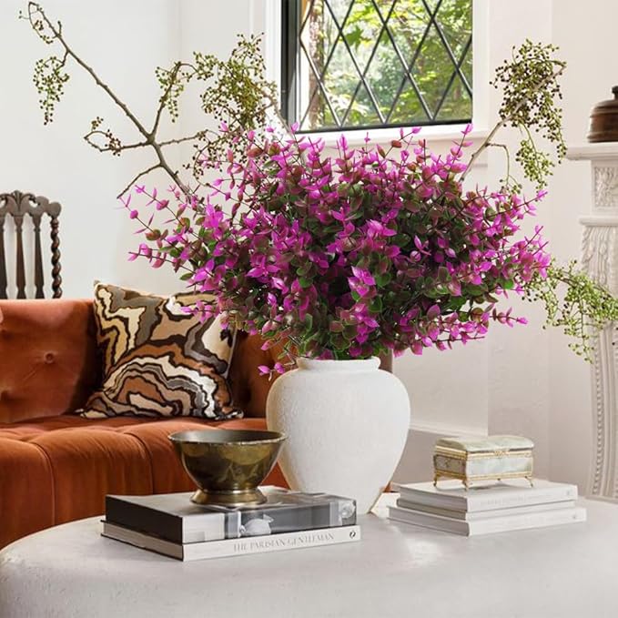 - 【8 Bundles Artificial Fake Flowers】- You will get 8 Bundles artificial flowers, these flowers are handmade to offer a more unique look in every bundle. Each plastic flowers has 7 flexible stems and bushy eucalyptus leaves. The artificial outdoors flowers' height is 13.8".