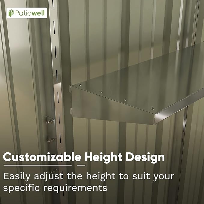 - 【Modern Design】The sleek metal exterior not only adds a contemporary touch to your outdoor space but also complements your surroundings, enhancing the aesthetic appeal of your property. Storage racks also enhance the overall aesthetics of your tool shed by creating a clean look.