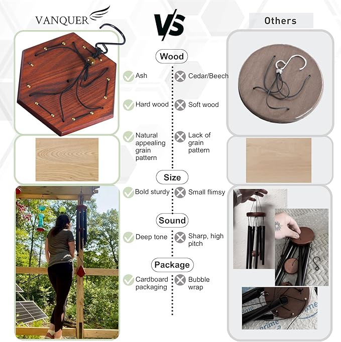 - ♬ Outdoor Wind Chimes - Made with premium materials, the metal wind chimes feature a suspension platform crafted from wood, treated to achieve a vintage look. Anodized aluminum tubes with a corrosion-resistant coating ensure durability against heat and humidity. A natural wood striker with a protective varnish coating and heavy-duty nylon cord ensures the chimes' beauty lasts for years.
