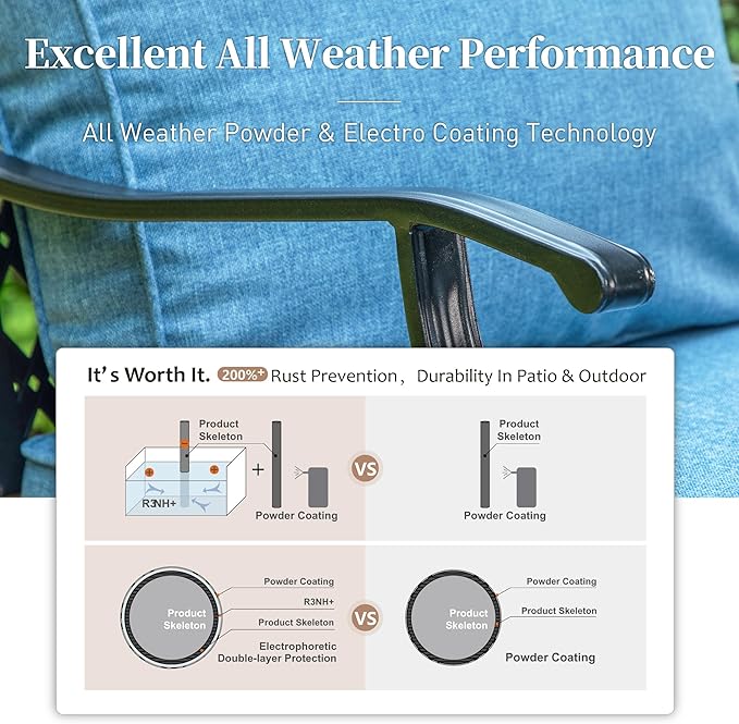 - ALL WEATHER HEAVY-DUTY FRAME: This metal backyard furniture set is made of high-performance E-COATING and POWDER-COATING dual rust prevention techniques that are All weather resistant, anti-rust, and easy to clean, with no special care needed. That patio conversation set has a heavy-duty wrought iron metal frame, The single chairs could support up to 350 lbs weight and the 3-seater sofa supports 900 lbs