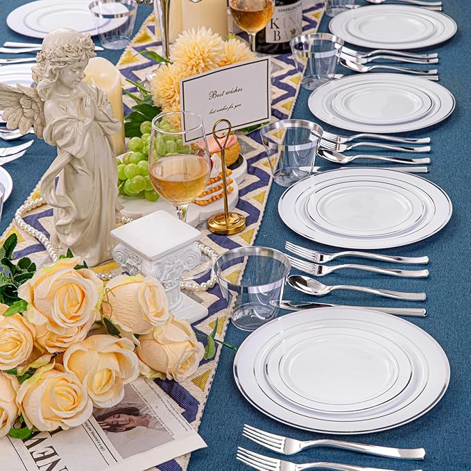 - Ideal for All Occasions: From weddings to casual get-togethers, our plastic plates with silver trim are the perfect addition to any event. They enhance the ambiance and provide a memorable dining experience