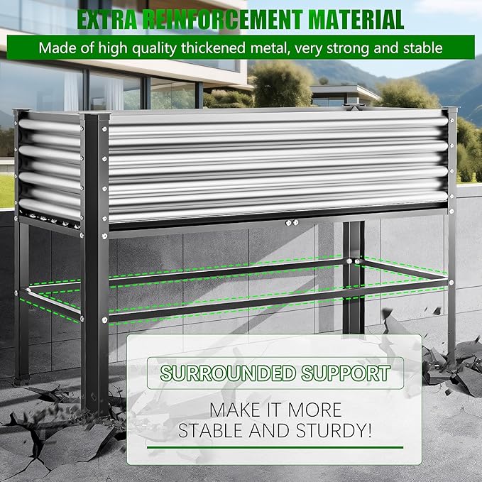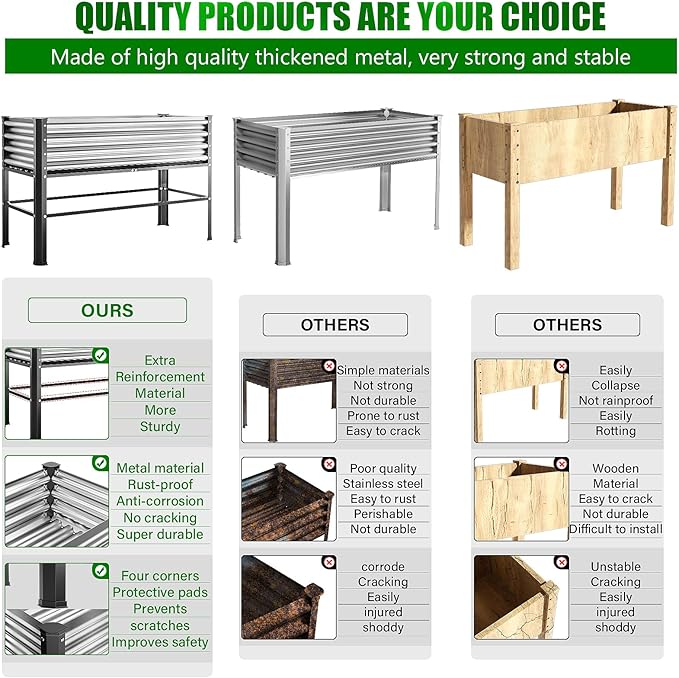 - 【Distinctive Design】-Outdoor elevated garden beds, our custom design style features galvanized sheet metal on the top, a stainless steel frame on the middle base, and the lower four corners are made of heavy-duty steel with a black powder-coated finish,This combination exceeds the lifespan of wooden products and ensures excellent rust resistance to keep the garden bed in the best condition for a long time.