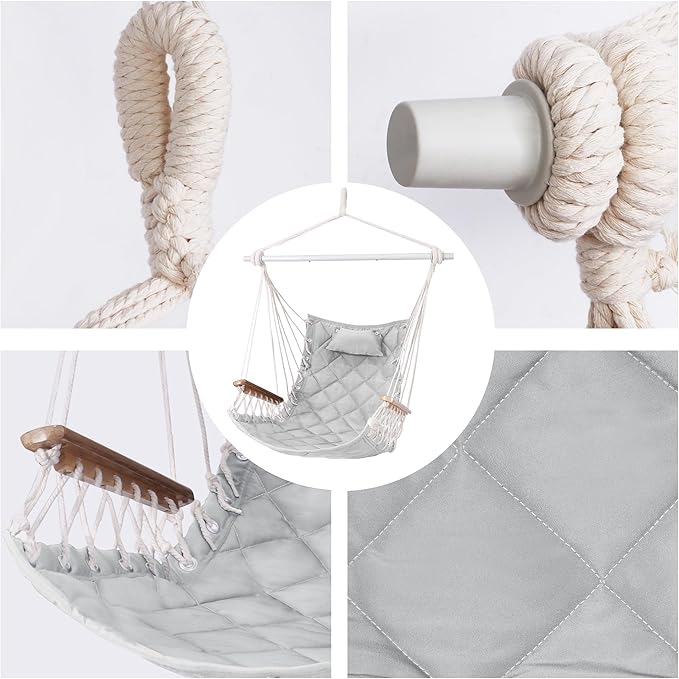 Hammock Chair Hanging Swing with Wooden Armrests;Steel Spreader Bar,Pillows,Hardware kit Included;Cotton Woven Fabric;Up to 350 Lbs,for Indoor Light Grey