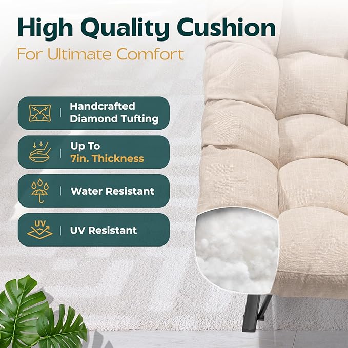 - THICK AND FLUFFY CUSHION: Overstuffed padded cushion with 7'' thickness increases the comfort and cozy to the lounging experience. The handcrafted diamond tufting of our rocking egg chair outdoor upgrates the aesthetics of the interior. Polyester fabric resists stains, water (only for LIGHT RAIN or DRIZZLE) and UV rays for long-term use and easy maintenance.
