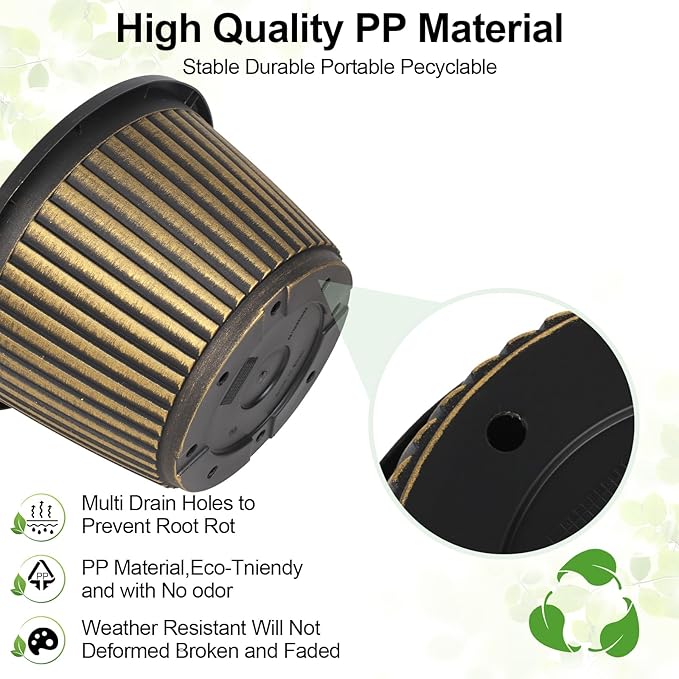 - 【Perfect Size & sturdy Material】Top diameter: 10 inch, bottom diameter: 6.7 inch, height: 7 inch, capacity: 1.7 gallon. Plastic plant pots are made of recyclable polypropylene resin which is lightweight but sturdy, not easy crack. These indoor outdoor planters are UV and weather resistant. 10 inch flower pot is perfect for planting medium to large sized plants.