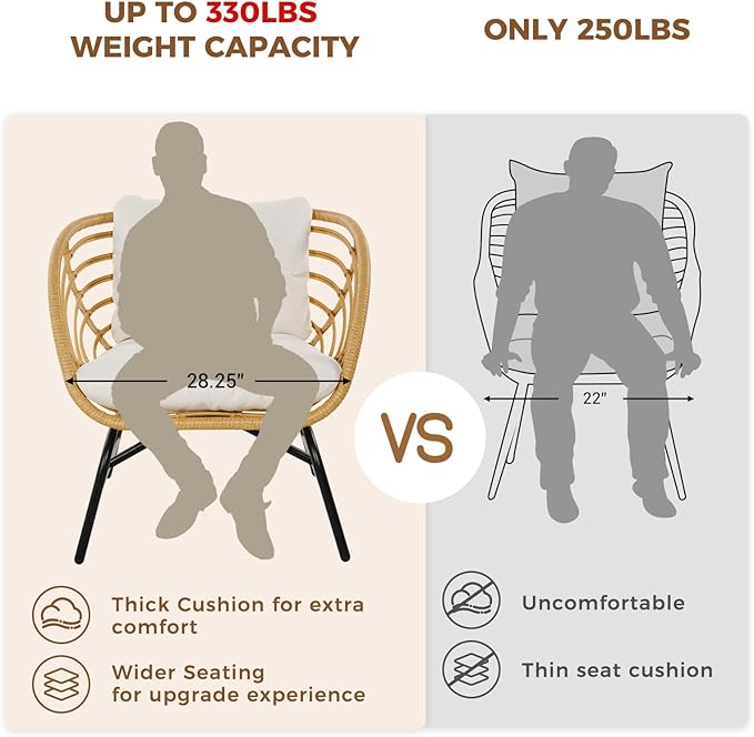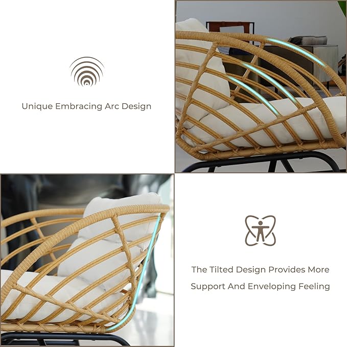 - EMBRACING ARC DESIGN:The wicker patio furniture sets has unique arc design, provide better support for your body and arm. Equipped with removable polyester cushion, resists fading, soft sitting and durable quality.Open weaving design, promotes air circulation in a hot summer environment, keeps you cool and cosy.The unique design adds more personality and charm to your courtyard, garden, terrace, pool, and other outdoor spaces, allowing you to enjoy leisurely moments
