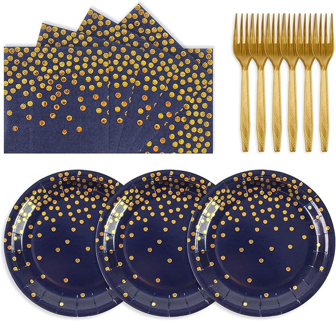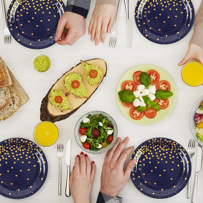 - 【PREMIUM GOLD FOIL DOT DESIGN】: Our dark blue and gold dot party paper plates and napkins are decorated with gold polka dots. Very stylish and beautiful with gorgeous and charming colors. Your guests will love this elegant and premium design.