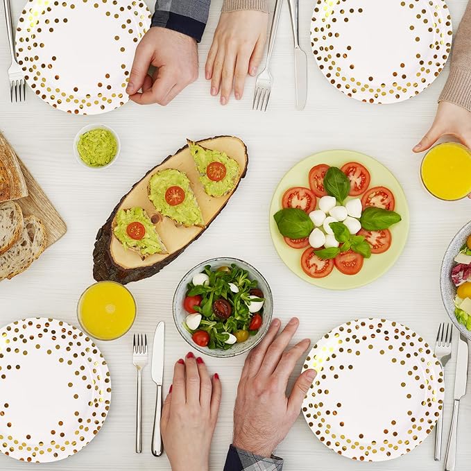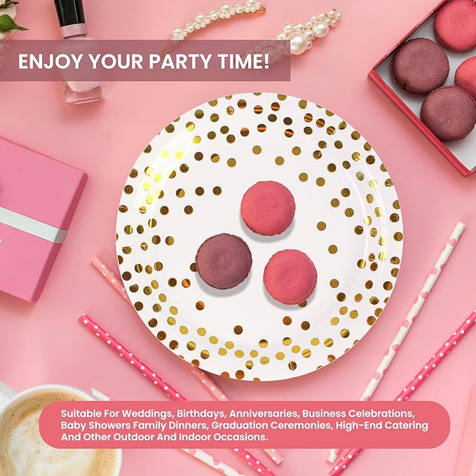 - 【HIGH QUALITY MATERIALS】: Our white and gold dot paper plates are made of 350gsm thickened eco-friendly paper, not easy to break or tear, durable, safe and non-toxic, bpa free biodegradable, convenient and environmentally friendly, no need to worry about harming the environment. The napkins are made of food grade water-based ink, highly absorbent and very skin-friendly.Please do not microwave the paper plates!