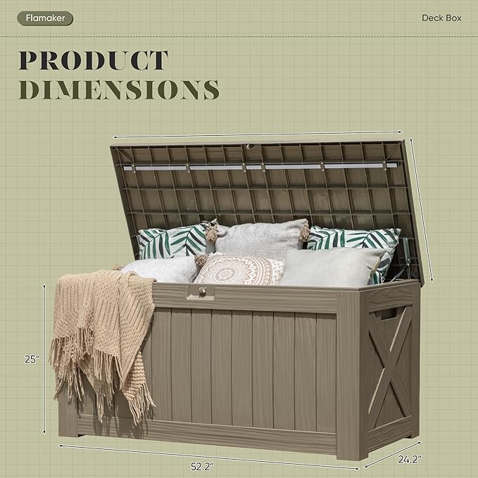 Flamaker Resin Deck Box 120 Gallon Waterproof Large Outdoor Indoor Storage Box Imitation Wood Resin for Patio Furniture Garden Tools and Pool (Brown)