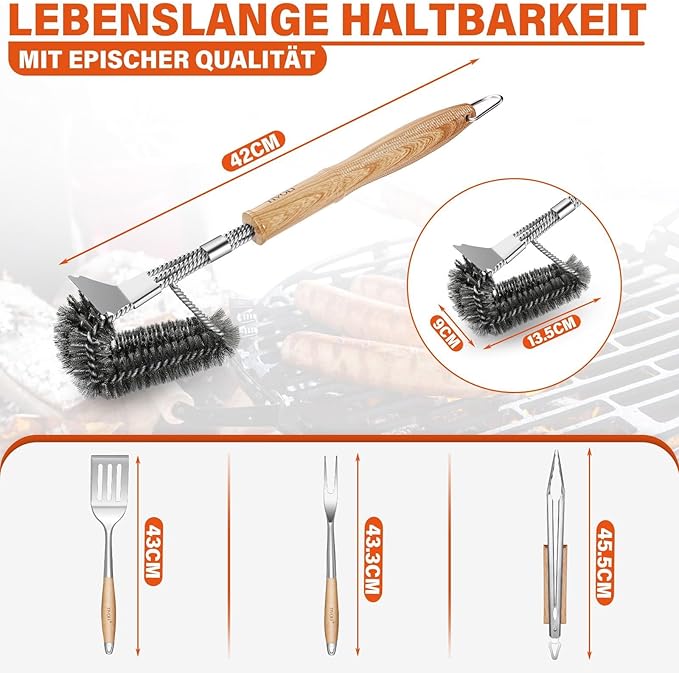- COMPLETE GRILL SET: Our premium 4-piece BBQ set includes BBQ tongs, a spatula, a BBQ brush, and a BBQ fork. With these grilling accessories, you have all the tools you need for successful grilling. Effortlessly turn, lift, and serve food. Perfect for daily grilling with family or friends.