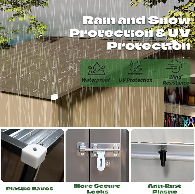 - All Weather Outdoor Storage Shed:Our outdoor storage shed made of durable structure and thick galvanized steel is real solid and durable, good flexibility, sun and corrosion resistance, durable, easy to clean. At the same time, for those outdoor patio storage tool shed also with upgrade thick metal supporting roof and stacked wallboard, which is not afraid of sun and rain, is suitable for long-term outdoor use