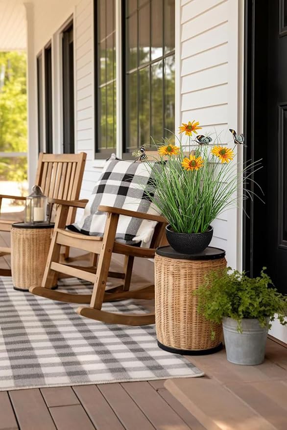 - Realistic Natural Appearance - Our fake house plants are designed to close to the real onion grass, with vivid and realistic yellow daisies, paired with slim and lush green onion grass leaves, the whole exudes a natural and fresh atmosphere. Strategically placed butterflies at varying heights and positions complement the slender lines of the faux grass plant, as if butterflies are gracefully perching or fluttering around, adding vibrancy and energy to the artificial potted plants