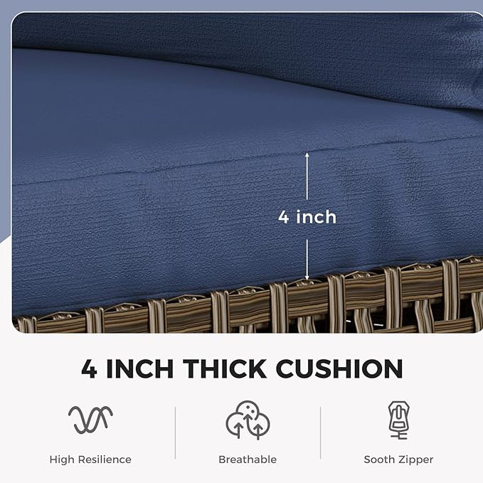 - WATER RESISTANT CUSHIONS: The outdoor-rated cushion covers are PU-coated polyester fabric that is UV-ray, stain, and moisture-resistant and is more substantial than standard polyester. The 4'' cushions of this 3 pieces outdoor conversation set, providing excellent support and reduces fatigue, allowing you to relax and immerse yourself in comfort for extended periods of time. In addition, the removable cushions with smooth zipper make cleaning a breeze