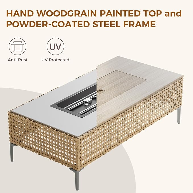 - ALL-WEATHER DURABILITY: The patio fire table boasts a 100% steel frame design, powder-coated for stability and long-lasting resilience against outdoor elements. Paired with hand-woven resin wicker rated at 1200 UV hours, the outdoor sectional sofa set is not only easy to clean but also highly resistant to sun, rain, heat, and cold, preventing cracking, sagging, or fading over time. Additionally, the wicker's texture has been enhanced for a more realistic and natural appearance