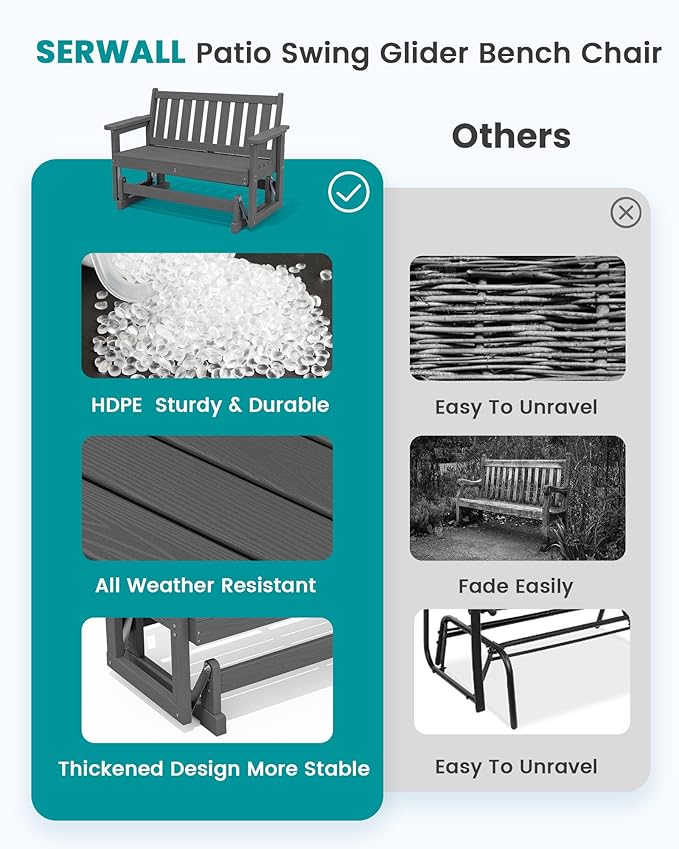 - [Outdoor Comfort] SERWALL outdoor swing chairs feature a unique wood-like texture, adding a touch of natural beauty to your space. Enjoy the fresh air and sunshine in comfort with this outdoor glider bench,create your outdoor relaxation paradise.