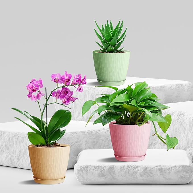 - Versatile Use: Suitable for a variety of houseplants and flowers, including Aloe Vera, Snake Plants, Spider Plants, Pothos, Peace Lily, ZZ plants, Mint, Parlor Palm, Cactus, Orchid, Succulents, and other small indoor plants. Enhance your indoor gardening experience with these stylish and functional 6 inch pots for plants with drainage. These small flower pots and plastic pots for plants are perfect for both indoor and outdoor use, making them ideal potting containers for plants.