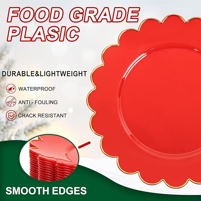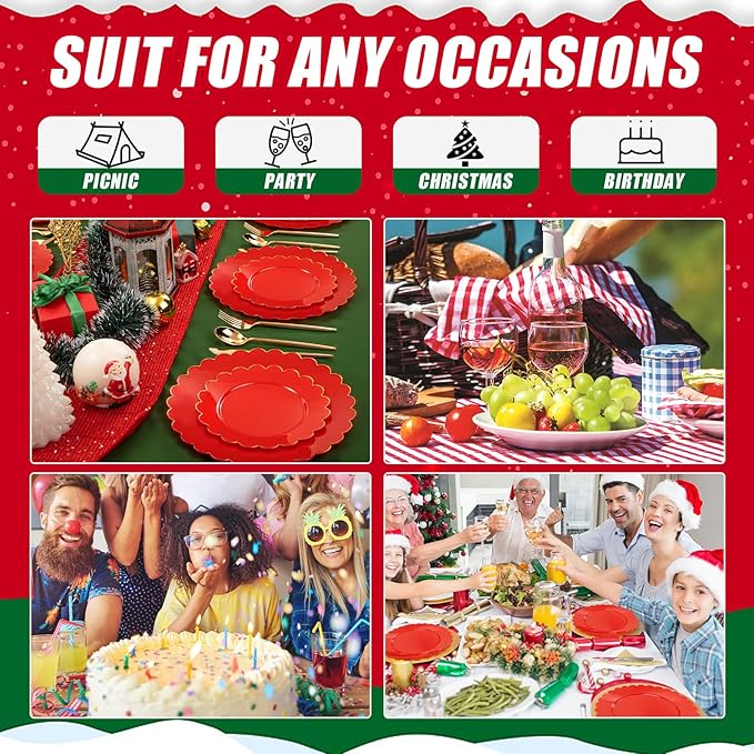 - 【AFFORDABLE FESTIVE ELEGANCE】These red gold Christmas plates dinnerware offer an affordable way to bring a touch of luxury and festivity to your celebrations. The plastic plates for Christmas party provide the look and feel of more expensive tableware at a fraction of the cost, allowing you to create a beautiful and stylish holiday table setting without straining your budget.