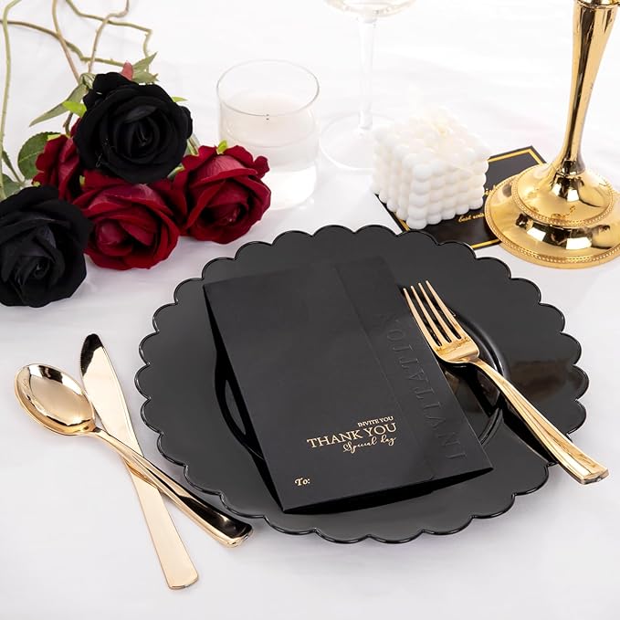 - 【Stunning Aesthetic】Our black plates feature a sleek and modern design that adds a touch of elegance to any table setting. The rich black color creates a sophisticated atmosphere, making them perfect for both casual family dinners and formal gatherings. With disposable plates smooth surface, these plates are sure to impress your guests.