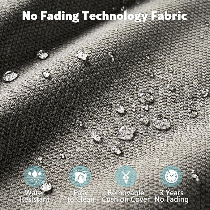 - Non-Fading Fabric:3-Year-Non-Fading,made with high-density foam that is soft and supportive, and covered with a breathable fabric that is easy to clean and maintain. The cushion covers are also water resistance, stain-resistant, ensuring they remain in excellent condition in all weather conditions