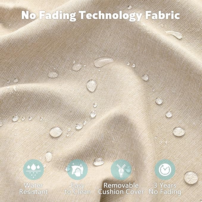 - Non-Fading Fabric:3-Year-Non-Fading,made with high-density foam that is soft and supportive, and covered with a breathable fabric that is easy to clean and maintain. The cushion covers are also water resistance, stain-resistant, ensuring they remain in excellent condition in all weather conditions