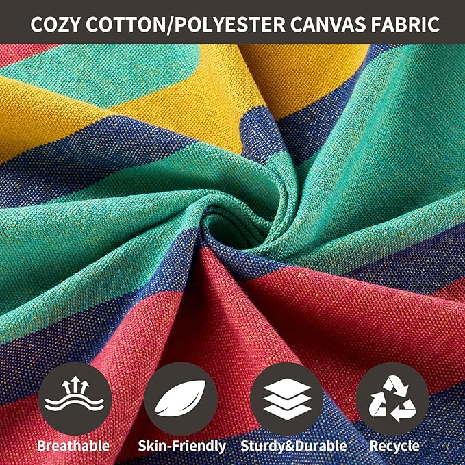 - Durable Hammock with 450LBS Weight Capacity,the cotton/polyester blended fabric is breathable and durable, with thick ropes and tight hand-weaven loops, Also,we prodvide two 2.5cm wide tree straps with high-strength polyester material and two 8cm carabiners,our hammocks are tested to hold 450lbs weight safely.