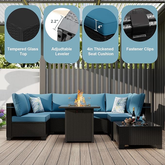 Patio Furniture Set with Fire Pit Table 28", 8-Piece Outdoor Furniture Set with Thick Cushions, Outside Wicker Sectional Sofa for Porch Garden Backyard, Coffee/Peacock Blue