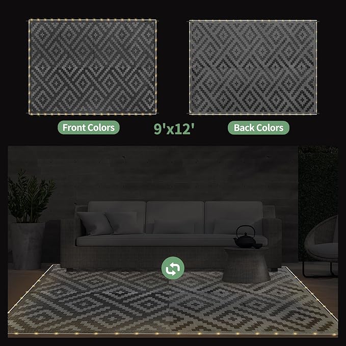 GENIMO Outdoor Rug with LED Strip Lights, 9'x12' Waterproof Camping Mat, Reversible Plastic Straw Rugs for Patio, RV, Camper, Balcony, Backyard, Picnic, Deck, Black & Gray