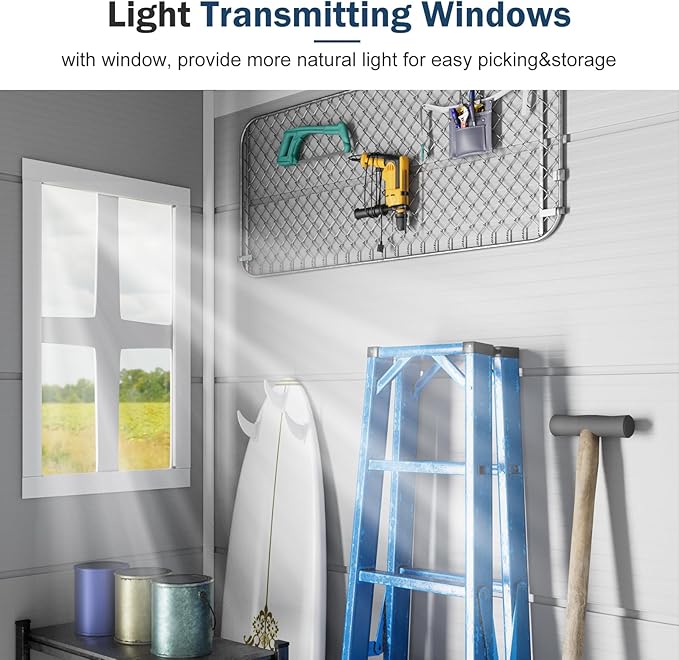 - 【DURABLE CONSTRUCTION WITH FLOOR&WINDOWS】 Made from extra thick double walled polypropylene resin construction & steel is durable enough to resist adverse weather. And the impact resistant floor is insulated from rain and insects, making the outdoor shed with floor corrosion resistant, moisture proof, and more resistant to wind and impact, ensuring that your stored items remain intact in the severe weather