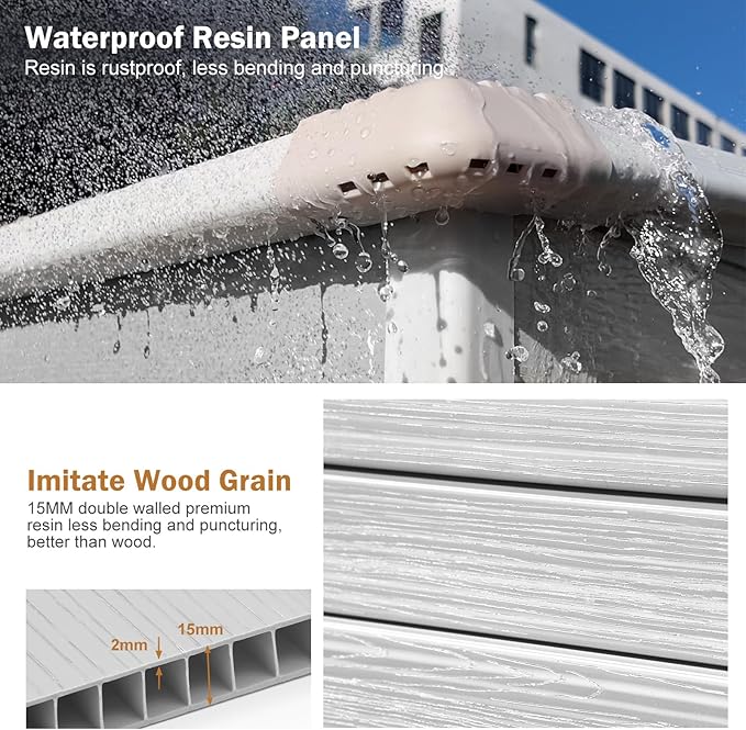 - 【PREMIUM RESIN MATERIALS SHEDS】 Our durable storage shed is crafted with 15MM premium polypropylene resin plastic, which is thicker than others in the market. Resin shed is waterproof, rustproof and UV-resistant, less bending and puncturing, worry-free for use in all weather conditions. It is a great shed house for your backyard, patio and garden