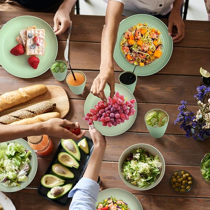 - š¾ Dinnerware sets service for 8: Includes 8 Dinner Plates, 8 Dessert Plates, 8 Dinner Bowls and 8 Cups. Our dinnerware set is made from wheat straw fiber and food grade PP, which is BPA-free and odorless, ensuring a high-quality choice for your family.