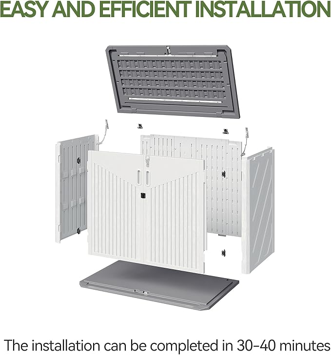 - Installation and delivery: This plastic storage shed has been optimized many times to achieve a simpler installation with fewer screws, which takes only 30-40 minutes for 1-2 people to install. This tool room has 2 packages, you may receive at different times, thank you for your patience