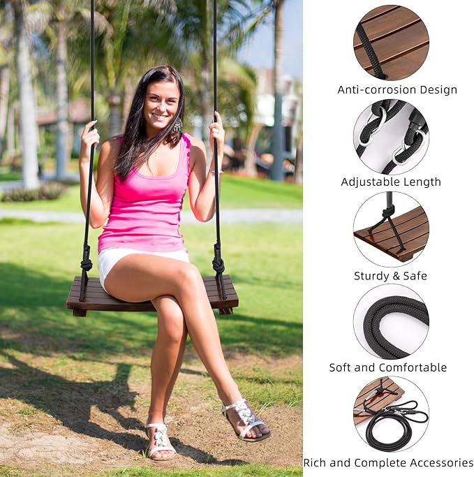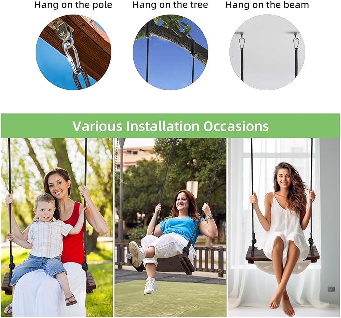 - Maximum Load 550 LBS of Carbonized Swings: High temperature carbonized material can withstand sun, wind and snow; PELLOR wood swing comes with 6.6 feet adjustable rope, galvanized metal rings and accessories, easy to hang on tree branches or beams