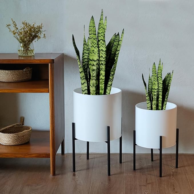 ARNIS Modern Plant Pots, Large Planters with Stand, Set of 2 Decorative Planters, Metal Pots with Drainage Holes for Living Room, Office, Garden or Balcony, 10.5 &12.25 Inch, White