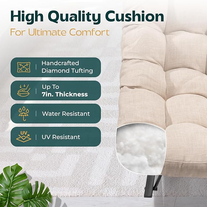 - THICK AND FLUFFY CUSHION: An overstuffed padded cushion with 7'' thickness increases the comfort and cozy to the lounging experience. The handcrafted diamond tufting of our rocking egg chair outdoor upgrades the aesthetics of the interior. Polyester fabric resists stains, water (only for LIGHT RAIN or DRIZZLE) and UV rays for long-term use and easy maintenance.