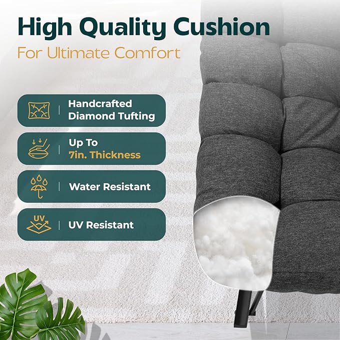 - THICK AND FLUFFY CUSHION: Overstuffed padded cushion with 7'' thickness increases the comfort and cozy to the lounging experience. The hanđcràted diamond tufting of our rocking egg chair outdoor upgrates the aesthetics of the interior. Polyester fabric resists stains, water (only for LIGHT RAIN or DRIZZLE) and UV rays for long-term use and easy maintenance.
