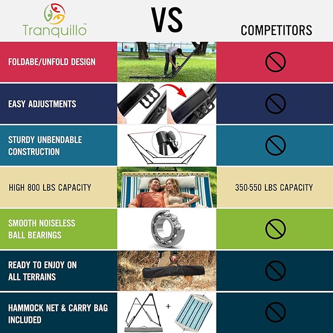 - PATENTED INNOVATIVE DESIGN: Proudly patented for its smart, tool-free setup in just 30 seconds, the Tranquillo Hammock with stand offers effortless outdoor relaxation. Easily adjustable for perfect comfort, built with durable materials for long-lasting use
